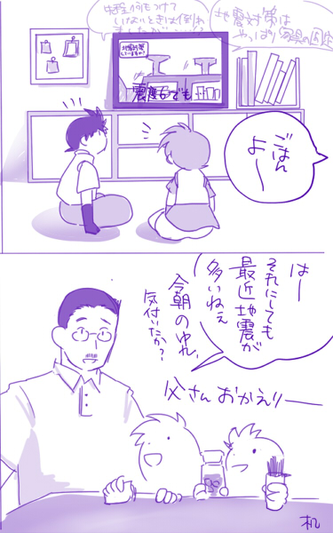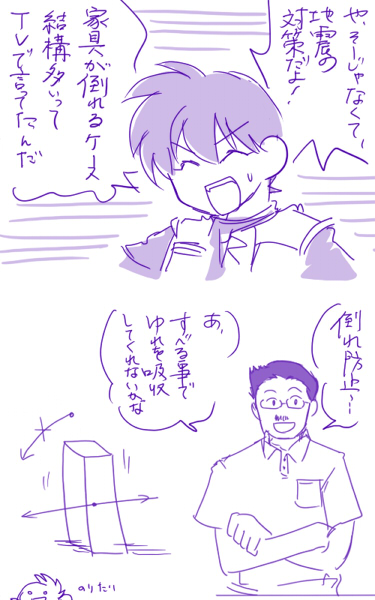 簡単に言うと、あらい家はもっと家具の耐震しろよ!というネタです。すみません。
