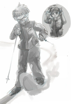 烈兄貴がスキーしてたら素敵なコーナリングでシュプールをえがくんだろうな って思って描いたら全身絵になりゴーグル必須で、着色しないとダレコレでした。